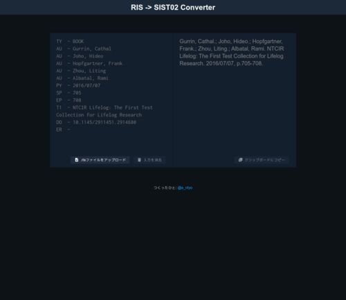 tl; dr 表題の通りです。SIST02形式の書誌引用を必要としている人にとってはかなり便利だと思います。 スクリーンショット ハァ~便利 pic.twitter.com/wiweWF54mH— iintyo (@e_ntyo) 2020年3月20日 J-STAGE pic.twitter.com/wO6WzHnztt— iintyo (@e_ntyo) 2020…
